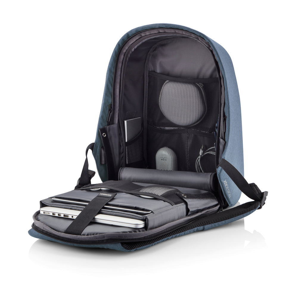 De Bobby Hero lijn vertegenwoordigt een nieuw tijdperk in anti-diefstal rugzakken en biedt veiligheid, gemak en organisatie voor je dagelijkse reizen. Snijbestendige bescherming, discrete ritsen en verborgen vakken zorgen voor de beveiliging van je bezittingen tijdens het woon-werkverkeer. De Bobby Hero Regular is uitgerust met een geïntegreerde USB-oplaadpoort, waterafstotende stof, verlichte veiligheidsstrepen en een bagagestrook voor extra gemak. Intern beschikken gewatteerde compartimenten over ruimte voor een laptop van 15,6” en een tablet tot 12,9”. Gemaakt van R-pet stof met de AWARE™ tracer. Met AWARE™ is het gebruik van echt gerecycled materiaal gegarandeerd. 29% gerecycled materiaal. Geregistreerd ontwerp®